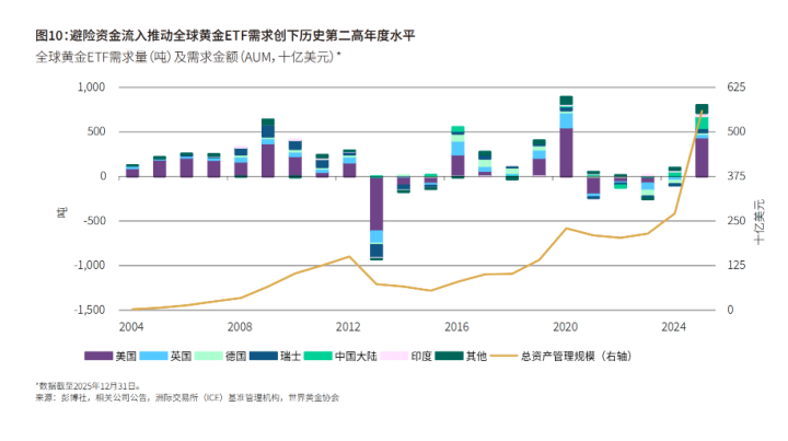 值得注意的是,2025年全球黄金ETF年度需求增量的逾半数来自北美基金(446吨),亚洲黄金ETF基金持仓增幅位居全球第二(215吨)。其中,中国黄金ETF持仓量全年实现翻倍以上增长(133吨),黄金ETF资产管理总规模(AUM)激增243%,两项数据均创历史新高。